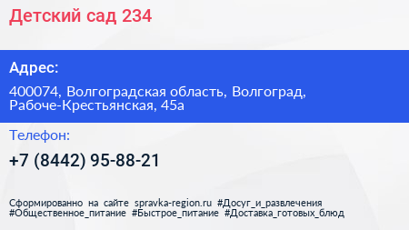 Детский сад №234 по адресу 400074, Волгоградская область, Волгоград, Рабоче-Крестьянская, 45а в дальнейшем Организация, размещена в следующих категориях: