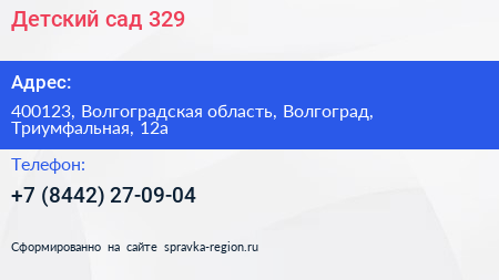 Детский сад №329 по адресу 400123, Волгоградская область, Волгоград, Триумфальная, 12а в дальнейшем Организация, размещена в следующих категориях: