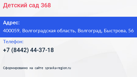 Детский сад №368 по адресу 400059, Волгоградская область, Волгоград, Быстрова, 56 в дальнейшем Организация, размещена в следующих категориях: