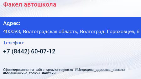 Факел, автошкола по адресу 400093, Волгоградская область, Волгоград, Гороховцев, 6 в дальнейшем Организация, размещена в следующих категориях: