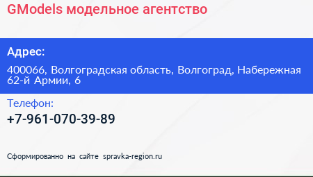 GModels, модельное агентство по адресу 400066, Волгоградская область, Волгоград, Набережная 62-й Армии, 6 в дальнейшем Организация, размещена в следующих категориях: