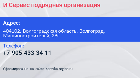 И-Сервис, подрядная организация по адресу 404102, Волгоградская область, Волгоград, Машиностроителей, 29г в дальнейшем Организация, размещена в следующих категориях: