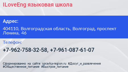 ILoveEng, языковая школа по адресу 404110, Волгоградская область, Волгоград, проспект Ленина, 46 в дальнейшем Организация, размещена в следующих категориях: