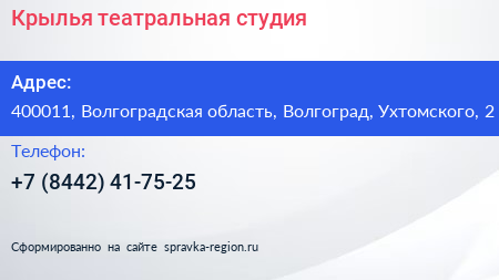 Крылья, театральная студия по адресу 400011, Волгоградская область, Волгоград, Ухтомского, 2 в дальнейшем Организация, размещена в следующих категориях: