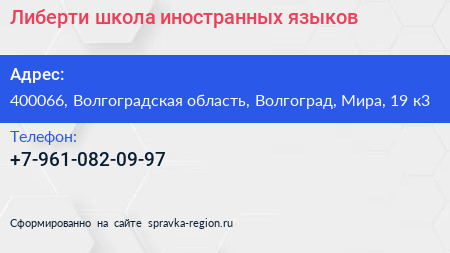 Либерти, школа иностранных языков по адресу 400066, Волгоградская область, Волгоград, Мира, 19 к3 в дальнейшем Организация, размещена в следующих категориях:
