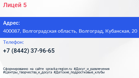 Лицей №5 по адресу 400087, Волгоградская область, Волгоград, Кубанская, 20 в дальнейшем Организация, размещена в следующих категориях: