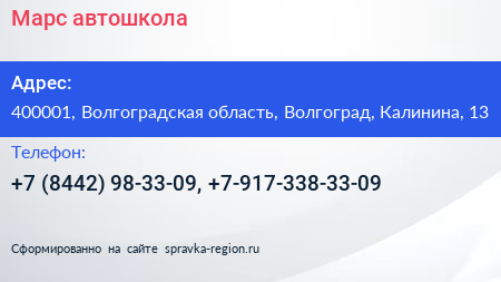 Марс, автошкола по адресу 400001, Волгоградская область, Волгоград, Калинина, 13 в дальнейшем Организация, размещена в следующих категориях: