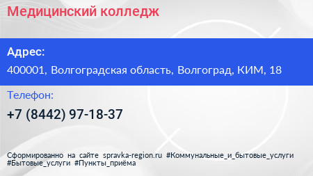 Медицинский колледж по адресу 400001, Волгоградская область, Волгоград, КИМ, 18 в дальнейшем Организация, размещена в следующих категориях: