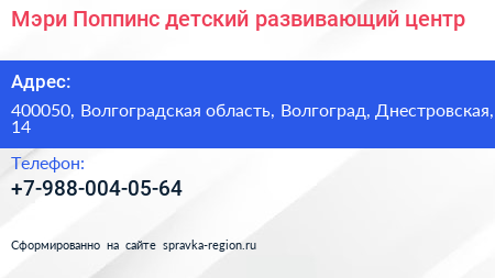 Мэри Поппинс, детский развивающий центр по адресу 400050, Волгоградская область, Волгоград, Днестровская, 14 в дальнейшем Организация, размещена в следующих категориях: