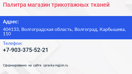 Палитра, магазин трикотажных тканей по адресу 404133, Волгоградская область, Волгоград, Карбышева, 110 в дальнейшем Организация, размещена в следующих категориях: