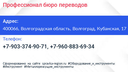 Профессионал, бюро переводов по адресу 400066, Волгоградская область, Волгоград, Кубанская, 17 в дальнейшем Организация, размещена в следующих категориях: