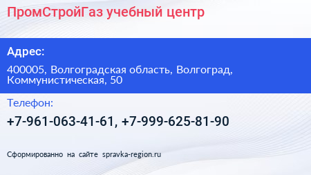 ПромСтройГаз, учебный центр по адресу 400005, Волгоградская область, Волгоград, Коммунистическая, 50 в дальнейшем Организация, размещена в следующих категориях: