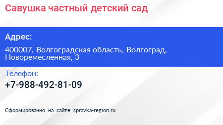 Савушка, частный детский сад по адресу 400007, Волгоградская область, Волгоград, Новоремесленная, 3 в дальнейшем Организация, размещена в следующих категориях:
