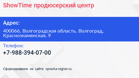 ShowTime, продюсерский центр по адресу 400066, Волгоградская область, Волгоград, Краснознаменская, 9 в дальнейшем Организация, размещена в следующих категориях:
