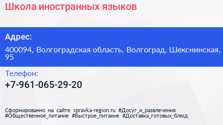 Школа иностранных языков по адресу 400094, Волгоградская область, Волгоград, Шекснинская, 95 в дальнейшем Организация, размещена в следующих категориях: