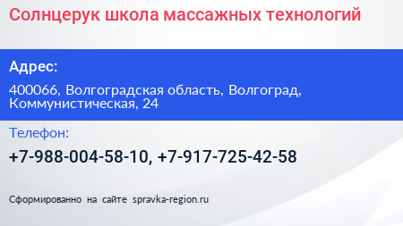 Солнцерук, школа массажных технологий по адресу 400066, Волгоградская область, Волгоград, Коммунистическая, 24 в дальнейшем Организация, размещена в следующих категориях: