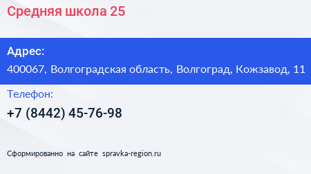 Средняя школа №25 по адресу 400067, Волгоградская область, Волгоград, Кожзавод, 11 в дальнейшем Организация, размещена в следующих категориях: