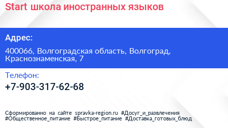 Start, школа иностранных языков по адресу 400066, Волгоградская область, Волгоград, Краснознаменская, 7 в дальнейшем Организация, размещена в следующих категориях: