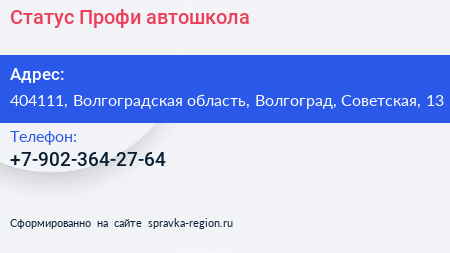 Статус-Профи, автошкола по адресу 404111, Волгоградская область, Волгоград, Советская, 13 в дальнейшем Организация, размещена в следующих категориях: