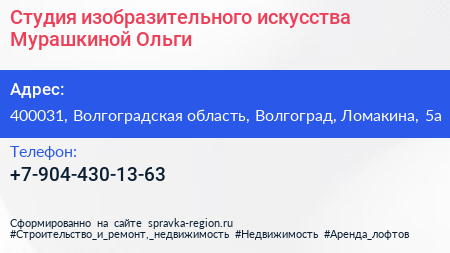 Студия изобразительного искусства Мурашкиной Ольги по адресу 400031, Волгоградская область, Волгоград, Ломакина, 5а в дальнейшем Организация, размещена в следующих категориях: