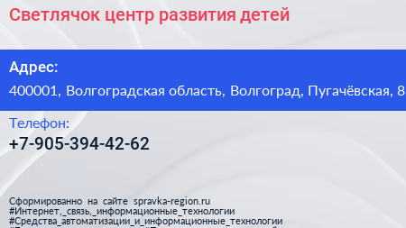 Светлячок, центр развития детей по адресу 400001, Волгоградская область, Волгоград, Пугачёвская, 8 в дальнейшем Организация, размещена в следующих категориях: