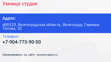 Умница, студия по адресу 400123, Волгоградская область, Волгоград, Германа Титова, 32 в дальнейшем Организация, размещена в следующих категориях: