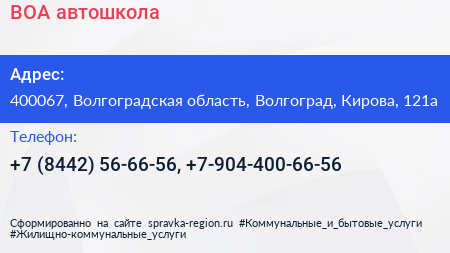 ВОА, автошкола по адресу 400067, Волгоградская область, Волгоград, Кирова, 121а в дальнейшем Организация, размещена в следующих категориях: