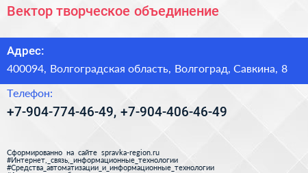 Вектор, творческое объединение по адресу 400094, Волгоградская область, Волгоград, Савкина, 8 в дальнейшем Организация, размещена в следующих категориях: