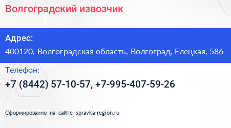 Волгоградский извозчик по адресу 400120, Волгоградская область, Волгоград, Елецкая, 586 в дальнейшем Организация, размещена в следующих категориях: