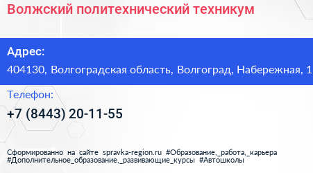 Волжский политехнический техникум по адресу 404130, Волгоградская область, Волгоград, Набережная, 1 в дальнейшем Организация, размещена в следующих категориях: