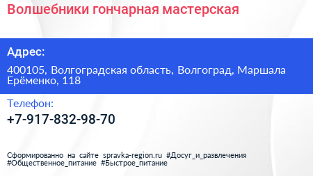 Волшебники, гончарная мастерская по адресу 400105, Волгоградская область, Волгоград, Маршала Ерёменко, 118 в дальнейшем Организация, размещена в следующих категориях: