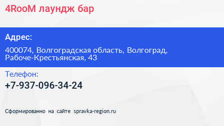 4RooM, лаундж-бар по адресу 400074, Волгоградская область, Волгоград, Рабоче-Крестьянская, 43 в дальнейшем Организация, размещена в следующих категориях:
