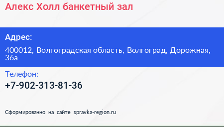 Алекс Холл, банкетный зал по адресу 400012, Волгоградская область, Волгоград, Дорожная, 36а в дальнейшем Организация, размещена в следующих категориях: