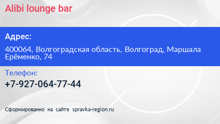 Alibi lounge bar по адресу 400064, Волгоградская область, Волгоград, Маршала Ерёменко, 74 в дальнейшем Организация, размещена в следующих категориях: