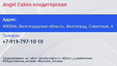 Angel Cakes, кондитерская по адресу 400066, Волгоградская область, Волгоград, Советская, 6 в дальнейшем Организация, размещена в следующих категориях: