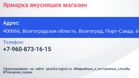 Ярмарка вкусняшек, магазин по адресу 400066, Волгоградская область, Волгоград, Порт-Саида, 6 в дальнейшем Организация, размещена в следующих категориях: