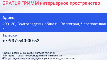 БРАТЬЯ ГРИММ, интерьерное пространство по адресу 400120, Волгоградская область, Волгоград, Череповецкая, 5 в дальнейшем Организация, размещена в следующих категориях: