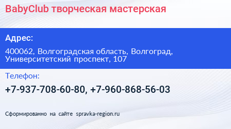 BabyClub, творческая мастерская по адресу 400062, Волгоградская область, Волгоград, Университетский проспект, 107 в дальнейшем Организация, размещена в следующих категориях: