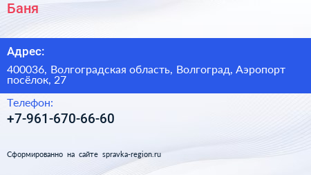 Баня по адресу 400036, Волгоградская область, Волгоград, Аэропорт посёлок, 27 в дальнейшем Организация, размещена в следующих категориях: