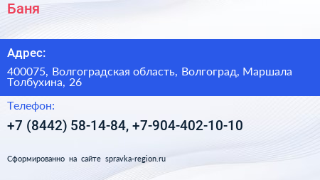 Баня по адресу 400075, Волгоградская область, Волгоград, Маршала Толбухина, 26 в дальнейшем Организация, размещена в следующих категориях: