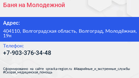 Баня на Молодежной по адресу 404110, Волгоградская область, Волгоград, Молодёжная, 19н в дальнейшем Организация, размещена в следующих категориях: