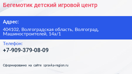Бегемотик, детский игровой центр по адресу 404102, Волгоградская область, Волгоград, Машиностроителей, 14а/1 в дальнейшем Организация, размещена в следующих категориях:
