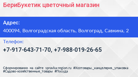 БериБукетик, цветочный магазин по адресу 400094, Волгоградская область, Волгоград, Савкина, 2 в дальнейшем Организация, размещена в следующих категориях: