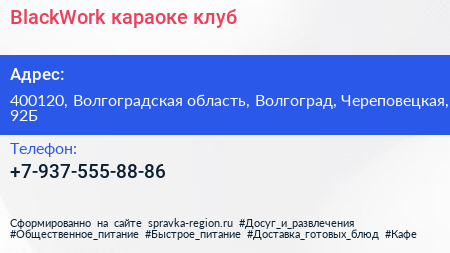 BlackWork, караоке-клуб по адресу 400120, Волгоградская область, Волгоград, Череповецкая, 92Б в дальнейшем Организация, размещена в следующих категориях: