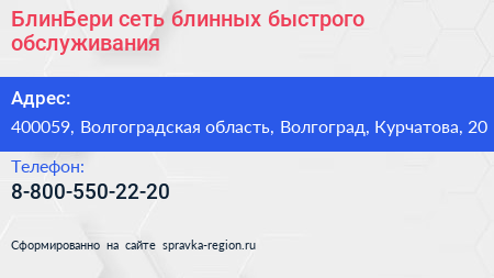 БлинБери, сеть блинных быстрого обслуживания по адресу 400059, Волгоградская область, Волгоград, Курчатова, 20 в дальнейшем Организация, размещена в следующих категориях: