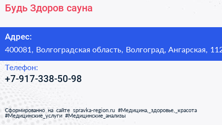 Будь Здоров, сауна по адресу 400081, Волгоградская область, Волгоград, Ангарская, 112 в дальнейшем Организация, размещена в следующих категориях: