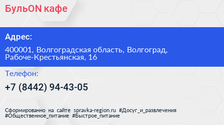 БульON, кафе по адресу 400001, Волгоградская область, Волгоград, Рабоче-Крестьянская, 16 в дальнейшем Организация, размещена в следующих категориях:
