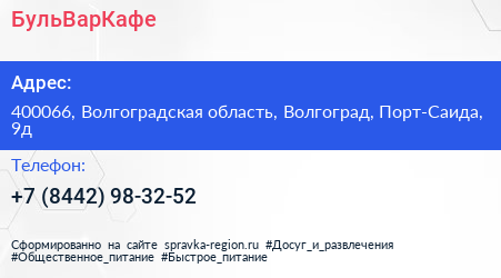 БульВарКафе по адресу 400066, Волгоградская область, Волгоград, Порт-Саида, 9д в дальнейшем Организация, размещена в следующих категориях: