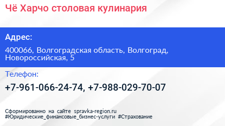 Чё? Харчо!, столовая-кулинария по адресу 400066, Волгоградская область, Волгоград, Новороссийская, 5 в дальнейшем Организация, размещена в следующих категориях: