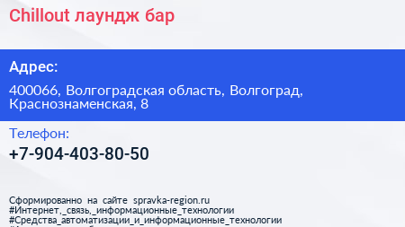 Chillout, лаундж-бар по адресу 400066, Волгоградская область, Волгоград, Краснознаменская, 8 в дальнейшем Организация, размещена в следующих категориях: